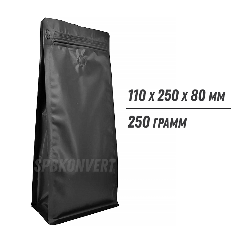ПАКЕТ ДЛЯ 0.25 КГ КОФЕ 110+80х250 мм ЧЕРНЫЙ с клапаном дегазации | восьмишовный