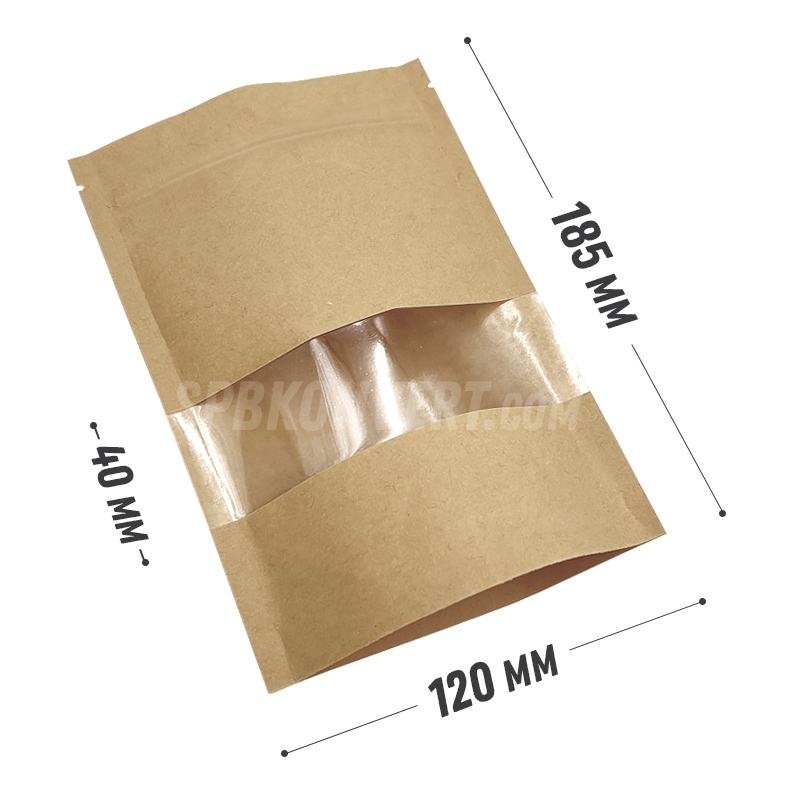 ПАКЕТ ДОЙ ПАК 120х185 мм КРАФТ С ПРОЗРАЧНЫМ ОКНОМ 40 мм, zip-lock